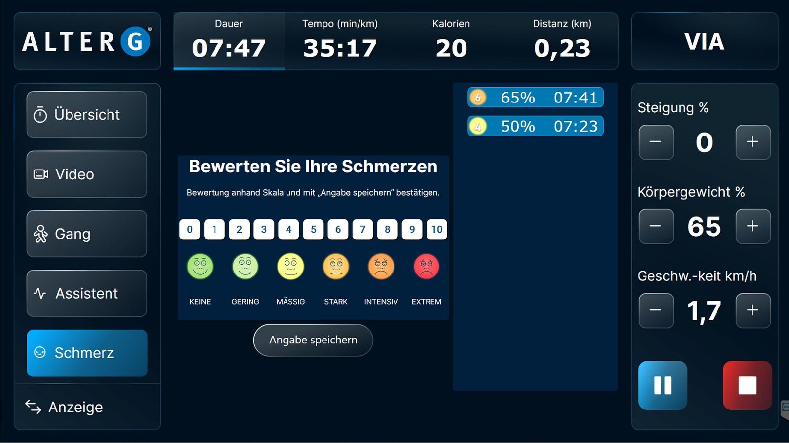 Das AlterG Stride Smart System dient als Feedback und liefert Daten zu den klassischen Gangparametern (Schrittlänge cm li/re, Gewichtsbelastung % li/re, Standzeit ms li/re und Kadenz) bis 4,8 km/h. Die Therapie und das Training können so visualisiert und optimiert werden.