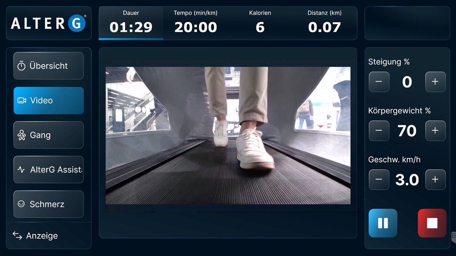 Das rehabilitative oder vorbereitende präoperative Ausdauer- und Gangtraining im AlterG zielt auf Schmerzfreiheit und Sturzsicherheit während eines körperentlasteten Gehens und Laufens. Das gelenkschonende Laufband beinhaltet Übungen mit geschlossener kinetischer Muskelkette. Die individuelle Körpergewichtsentlastung von bis zu 80 % in 1 % Schritten erlaubt längere, funktionellere und intensivere Trainingseinheiten. So ist eine Steigerung des Trainingsvolumens bei Reduzierung des Risikos belastungsbedingter Verletzungen möglich. Das propriozeptive neuromuskuläre Training am Laufband mit Gewichtsentlastung fördert Gleichgewicht und Selbstvertrauen des Patienten.